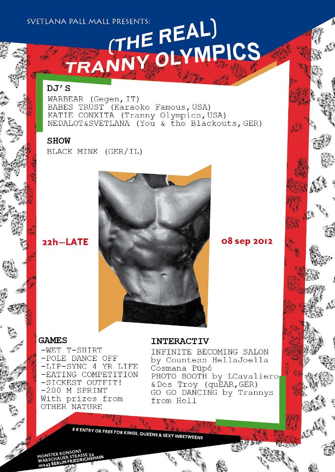 Some words of the organizers: For the third year in a row (the real) Tranny Olympics is finally about to take place once again. The legendary East London party has branched out and established itself as one of the most fun yearly events in Berlin. This is a celebration of the diversity of gender, sexuality and fierceness!