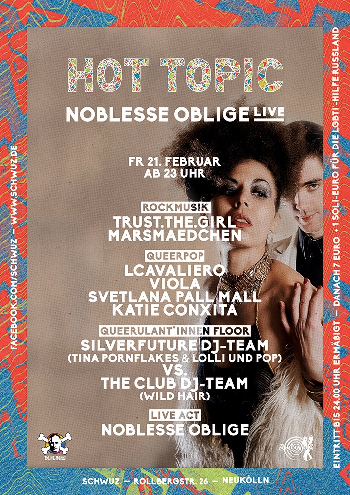 Der dritte Freitag im Monat bietet jedes Mal eine Bühne für einen Live-Act zur Unterstützung der queeren Szene Berlins. Diesmal: Noblesse Oblige!