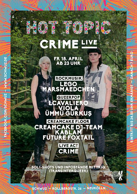 Die nexte Hot Topic steht vor der Tür. YES! Diemal mit Soli-Shots und Infos zu TrIQ (TransInterQueer). Live präsentiert sich Crime! Tanzen könnt Ihr zu LEGO, Marsmädchen (Rock-Floor), Creamcake DJ-Team, Kablam & Future Foxtail (Queerulant*innen-Floor) und Viola und ich schwingen zusammen mit ümmü gürkus die Turntables auf dem Queer-Pop-Floor. Mit ümmü gürkus (Gayhane) das Set zu teilen wird fabulös, denn er spielt elektrotürkpanpopmucke & oriental! Yes! Kommt tanzen!