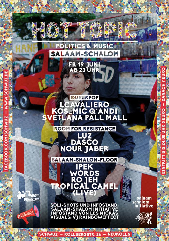 Die Salaam-Schalom Initiative lädt alle zu einer haram-unkoscheren Party ein: „Komm, sündige und feiere mit uns ein rassismusfreies Neukölln! Die Erlöse aus dem Getränkeverkauf gehen an unsere Initiative und unsere Projekte im Kiez.“